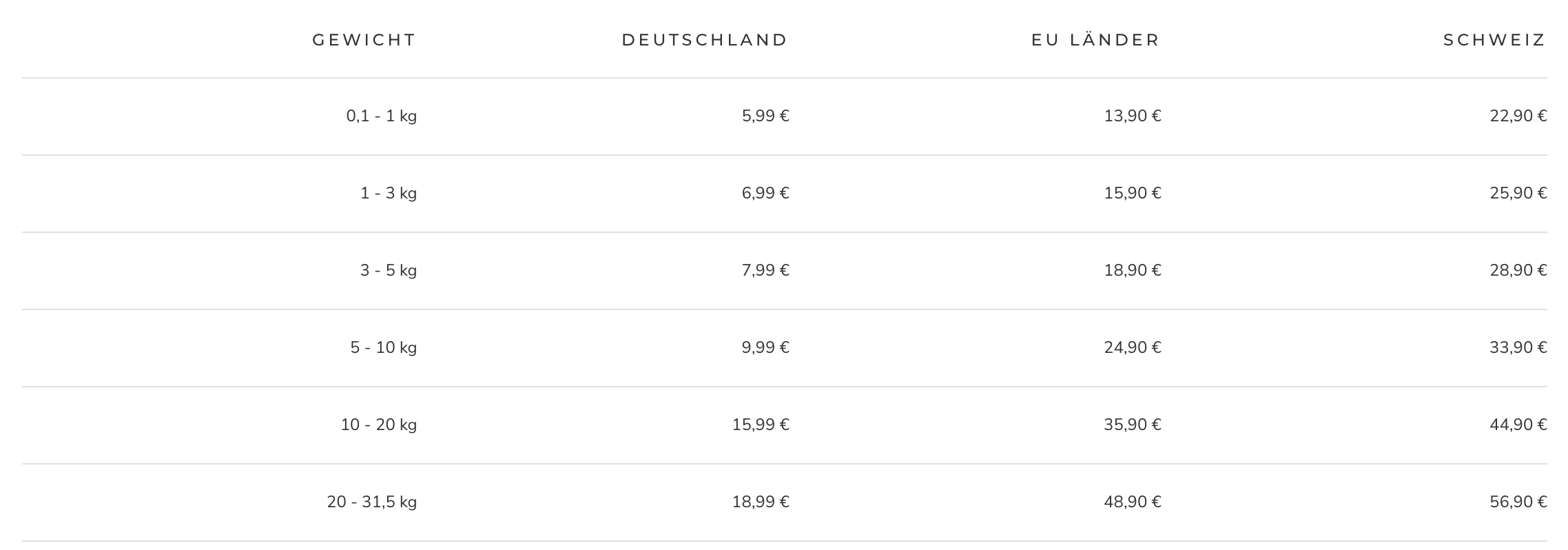 Frau Frauchen versendet weltweit mit DHL und DPD als Versandpartner. Wir versuchen dabei stets, die Versandkosten für dich so gering wie möglich zu halten. Die folgende Tabelle gibt einen Überblick über alle Versandkosten. Die Versandkosten enthalten die gesetzliche Mehrwertsteuer.